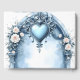 An ornate light blue archway with floral accents, a heart emblem, and roses. Discover an elegant archway featuring two columns with a vaulted top, richly adorned with intricate carvings and a central heart-shaped emblem. White roses with peach hues, delicate leaves, and small white blossoms frame the strikingly designed portal. Ideal for company or product presentations, weddings, or event designs that combine classic romance with modern colour schemes.