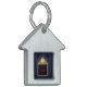 This awesome pet tag features a graphic image of a brown nestbox in a clock tower with two red eyed ravens flying towards it, one from the left and one from the right. The Ravens are black and have red eyes. There is also a third Raven hiding inside the black darkness of the nest with only the creepy red eyes showing in the dark. There is a clock above the entrance to the nest with a yellow face and darker roman numerals on it. Instead of 12 at the top there is a 13. The design gets its name from a group of Ravens which is known as an unkindness.