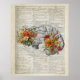 This stylish contemporary art print combines a detailed anatomical illustration of the brain with a bouquet of warm summer garden flowers, set against a vintage dictionary page backdrop.