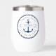 Thermal tumbler featuring an anchor with a ribbon banner across it with customizable title. Add your name above and boat name below. Around the anchor and text is a round rope border. Dark blue design on white background.