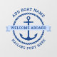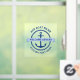 Window cling featuring a dark blue nautical anchor surrounded by a rope border on a white background. Across the anchor is a light blue ribbon with custom text "welcome aboard". Add your boat name above and hailing port below.