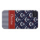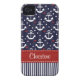 This custom navy blue and white anchor iPhone 4 and 4s Case-Mate BarelyThere cover with stripes, hearts and a polka dot pattern can be personalized with your name on the red and white stitched ribbon design. Accessorize your favourite gadget with this preppy and stylish nautical inspired iPhone 4th generation case. This 4th gen iPhone case makes a cute gift for women, a captain's wife, teen or any girly girl. This universal case for her fits iPhone 4/4s Verizon, Sprint and AT&T phones. Artwork © Chrissy H. Studios, LLC. All Rights Reserved.