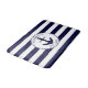 Nautical bath mat is a beach themed bathroom decor that is decorated with a navy blue ship anchor, family name, year of est., navy and white stripes, and a rope circle. It's easy to personalize this bath mat with your name, initials, family name or another text.