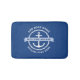 Bath mat featuring a white nautical anchor surrounded by a rope border on a dark blue background. Across the anchor is a light blue banner with customizable text "welcome aboard". Add your boat's name and hailing port.