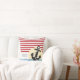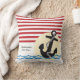 This pillow features a graphic of an anchor with a rope, a yellow and white striped sun and several lines of blue water waves all on a red and white striped background. Customizable text allows for personalization. This pillow is a perfect accent for any lake or beach home.
