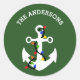 Seal up Christmas cards in nautical style with these personalized envelope seals. The round stickers have an illustration of a boat anchor in white that's wrapped in colourful Christmas lights. These stickers are ready to be personalized with your name above in white lettering against a festive green background.