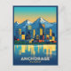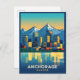 A stylized illustration of the Anchorage, Alaska skyline at sunset, featuring mountains, water, and city buildings.