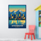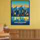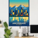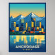 A stylized illustration of the Anchorage, Alaska skyline at sunset, featuring mountains, water, and city buildings.