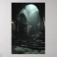 A monumental stone staircase rises through swirling mist inside a decayed Gothic cathedral, illuminated by soft daylight streaming through a broken oculus high above. Tall arches, cracked columns, and an imposing carved door stand in solemn silence, their surfaces aged by time and water, while faint sconce light adds warm flickers to the cold gray stone. The atmosphere is heavy with reverence, melancholy, forgotten sanctity, and the quiet pull toward transcendence—ideal for meditation rooms, moody bedrooms, home offices, therapy spaces, gothic-themed reading nooks, or as evocative gifts for lovers of ancient architecture, spiritual introspection, dark romanticism, fantasy ruins, or anyone drawn to haunting, atmospheric depth.