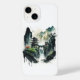 A beautiful iPhone 14 case showing an ink illustration of a landscape with ancient Chinese architecture and majestic waterfalls.