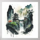 A beautiful foil print showing an ink illustration of a landscape with ancient Chinese architecture and majestic waterfalls.