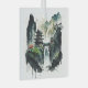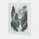 A beautiful square ornament showing an ink illustration of a landscape with ancient Chinese architecture and majestic waterfalls.