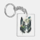 A beautiful square keychain showing an ink illustration of a landscape with ancient Chinese architecture and majestic waterfalls.