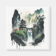 A beautiful square magnet showing an ink illustration of a landscape with ancient Chinese architecture and majestic waterfalls.