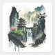 A beautiful set of square stickers showing an ink illustration of a landscape with ancient Chinese architecture and majestic waterfalls.