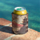 A beautiful brown can cooler with a paper cutout scene depicting ancient Chinese building, trees, mountains and lake.
