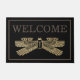 This custom Ancient Egyptian art hieroglyphic door mat or outdoor rug features an image of a winged scarab across the centre of the mat. The wings of the scarab span most of the width. The sparkly effect in the gold colour give it a glitter like appearance. The simple phrase "Welcome" is printed above the picture in a warm brown colour. A matching brown frame borders the rug.