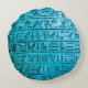 A blue round pillow with ancient hieroglyphs engraved on stone.