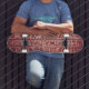 A red skateboard with ancient hieroglyphs engraved on stone. Super cool.
