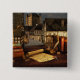 A surreal 3D play on perspective created in Vue. In the background is a quiet medieval city street in late afternoon, the warm glow of the setting sun enhanced by the lamps burning along the walls. Half-timbered houses and inns with thatched roofs line the street, and behind them is visible against the sky a tall, square tower with four corner turrets. This large-scale scene merges into a smaller foreground still life showing a desk littered with books. The books are as tall as the stone wall and houses they lean against, and the cobblestone street fades smoothly into the wood grain of the table. In addition to the books there sits on the desk a feather pen and ink bottle, a compass, an hourglass, a mounted magnifying glass, and a parchment letter with an official seal. Two candles light the desk with a soft glow as the lamps light the street.