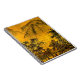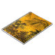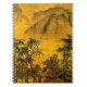 This fine art notebook features an impression of an ancient oriental landscape. Two small figures are walking through trees in the foreground. Mountains loom in the distance. The autumn colours are gold, yellow, orange, green, brown and black.