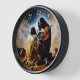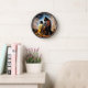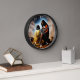 The size of the clock is dramatic and the abstract alcohol ink design is soothing and intricate at the same time. I chose the black frame that adds pop to the blue and gold design. The gold printing would be better in a slightly darker or larger font. I love it and I’m looking for just the right place in ny new apartment. I would recommend this clock for a personal gift or a present. I feel that the quality is excellent for the money! I’m a bit of a clock nut so I’m pretty particular about my purchases. The clock is larger in diameter than many if the clocks I have, so it stands out very well. I think a slightly darker printing color and a moderately larger size would best suit a professional decor or add more impact in a work place item.