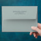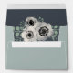 Dusty sage green envelopes feature a deep smoky blue grey liner accented with a spray of ivory anemone flowers and sage green eucalyptus branches. Add your return address details to the back flap in elegant and modern italic and block lettering. Coordinates with our Anemone and Eucalyptus wedding invitation collection.