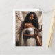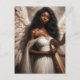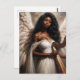 This angel-core postcard features oil painting portrait style artwork of a beautiful dark-skinned angel with long dark hair and large wings holding a harp. A melanin-rich depiction of a supernatural biblical creature/Christian symbol with an African appearance.
