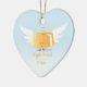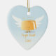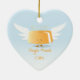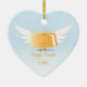 A Christmas ornament with a smiling angel food cake character. This cute cake has wings and a halo as it looks out from a blue background. The words "Angel Food Cake" are written below it and can be customized.