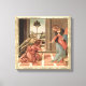 vintage and antique renaissance painting by the florentine artist sandro botticelli of the angel gabriel announcing the news to mary in a beautiful earth colored interior with patterned floor, and a gorgeous landscape with trees, castle on a hill, bridge, and twining river is seen through a doorway into the garden. italian renascence style painting of 'the annunciation' with the angel gabriel in a beautiful pink cloak, wings, and holding a white lily flower, is gesturing to mary who is wearing red and blue gown and is demure and reluctant in her expression, both are inside a house with a doorway that through which is seen a lovely rural landscape.