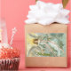 vintage art with painting of an angel in light blue dress floating in the sky among the clouds and holding flowers.