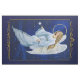 Linda Baysinger Peck’s painting of a white, flying angel, with blue night sky, clouds and stars. Gold metallic look border and scrolls surround the edges.