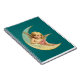 A sweet vintage drawing. A peaceful kind child-like angel resting on the curve of a crescent moon on a dark green background.