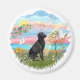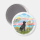 By the sparking blue water and against a background of a multi coloured sunlit sky, a happy black Labrador Retriever sits peacefully as a guardian angel appears in the clouds and a dove hovers in the light of a day star.