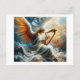 A serene angel with flowing garments and radiant wings is playing a harp amidst a swirling backdrop of ethereal clouds. Soft light beams illuminate the scene, adding a heavenly glow to the composition.