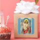 vintage painting of an angel with with a large red ribbon, lovely white smock with gold trimmings and hands together in prayer