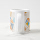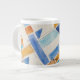 A mug with a watercolor art with geometric shapes in the base colors, orange and blue, painted in an intuitive and coordinated manner to leave harmonic spaces between the formats, making the work unique and pleasant to the eyes.