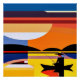 An A.I. created interpretation of a cubist, geometric composition representing the silhouette of an angler wearing a large hat sitting in a small boat with the fishing rod angled over a calm lake reflecting the distant sunset.