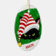 This cute Christmas ornament will bring some smiles this Season! The face of a rather angry black cat is at the front centre. The cat wears a red and white striped Santa hat, and rests on a Christmas green background. Your custom text is in red at the bottom. The back of the ornament has black and red text that says "When you stop believing you get socks". Fun, and so true!