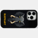 This iPhone case is for elephant lovers. The design features a grumpy and angry looking elephant with yellow eyes. You can personalize the text.