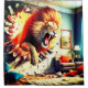 This shower curtain has a cool picture of am angry lion crashing through a wall on it.