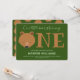 Our little cub is turning one first baby birthday invitation. This invitation is green and brown. The word "One" in large letters with a bear face illustration as the first letter of the word. Simply, customize this invitation, add it to your cart, and happy birthday to your wonderful baby!