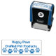 Self inking stamp, with a row of fun animal paw prints, across the bottom, and two lines of custom text. Personalize the text to read what you want.