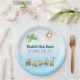 Personalized paper plates for a birthday or shower. Designed with cute children's themed nursery art illustrations of a little doggy riding in an airplane and a toy train filled with whimsical animals. A bright orange doodle sun shines overhead. Set on a light blue ombre background.