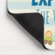 A cute personalized mousepad which says explore the world. Designed with a cute childrens themed nursery art illustration of a little doggy riding in an airplane and a toy train filled with whimsical animals. A doodle sun shining above. Set on a cream and blue striped background.
