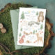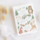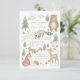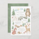 Invitation baby shower neutre genre avec scène forestière illustrée à la main avec arbres, fleurs, champignons, ours, lapin, raton laveur, écureuil, cerf, oiseau, renard et hérisson.