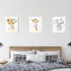 Ajoutez des touches de finition à la crèche de votre bébé ou à la chambre de votre enfant avec ces magnifiques gravures d’art ! Le design présente des animaux de la jungle (lion, girafe, éléphant), gomme à bulle bleue, fleurs d'aquarelle bleue et verdure.
