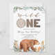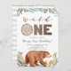 Le design est pour un premier anniversaire ! Comprend un ours, un hibou, un lapin, un écureuil, une typographie amusante et de la verdure. Une invitation simple et sucrée pour fêter le 1er anniversaire de votre petit garçon sauvage ! Personnalisez le texte modifiable. Parfait pour un thème d'anniversaire automne et automne.