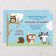 Forêt Animaux Invitation d'anniversaire pour votre fête d'anniversaire de thème de la nature. Il est configuré pour être une invitation de taille 5x7 et comprend des enveloppes blanches vierges. Graphiques de hibou, hérisson, renard et raton laveur ©Art de Jess