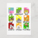 La carte postale Animaux sur Parade présente diverses images animalières colorées et des textes de style enfant. Les animaux comprennent l'hippo, la girafe, le singe, le taureau, le lion, l'éléphant, le cochon, le zèbre et le mouton.